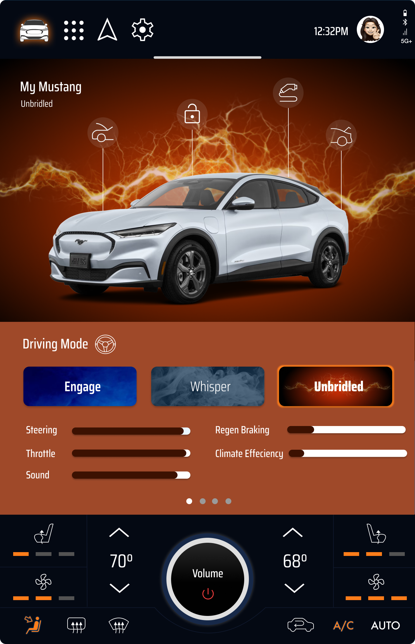 The current Mach-E interface is clean and usable, but it reads as a generic EV rather than a Mustang. Three friction points define the gap: