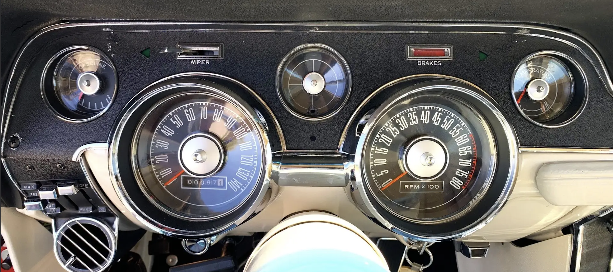 1967 Mustang GT - Bold circular gauges and mechanical symmetry reinforce a performance-first identity. The layout centers the driver’s focus on speed, feedback, and control.